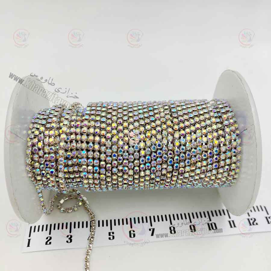 نگینهای هفت رنگ با بازتاب نور، طیف زیبایی از رنگها را نمایش میدهند و جلوهای درخشان و چشمنواز به کار شما میبخشند. پایهی فلزی نقرهایرنگ، ترکیب آن را شیک و هماهنگ با اغلب رنگها کرده و جلوهای تمیز و مرتب در اجرای نهایی ایجاد میکند.