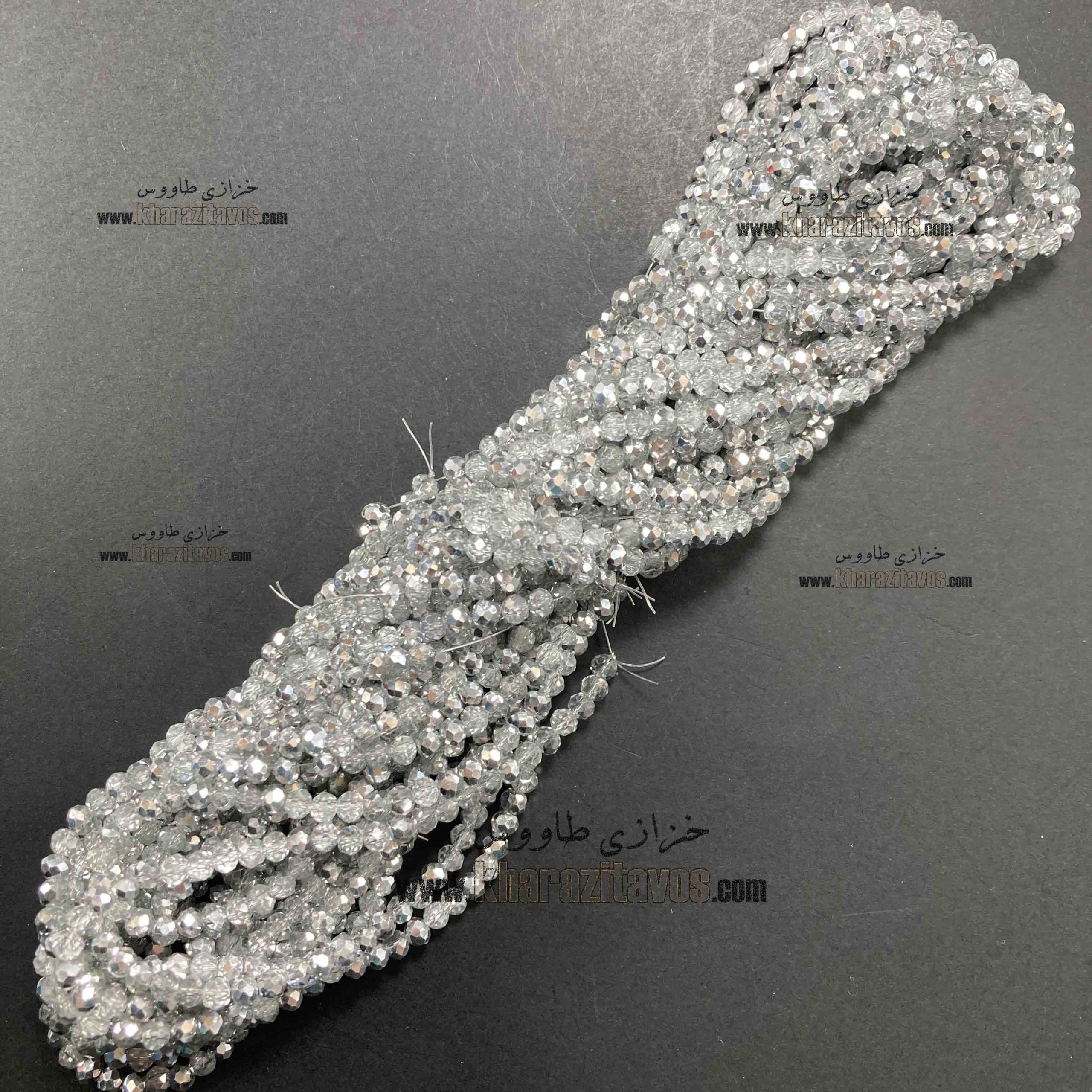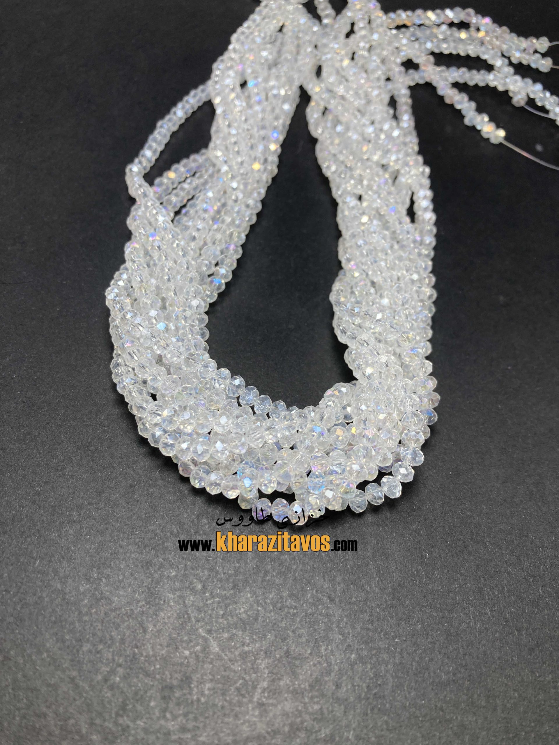 کریستال سنگی سایز 6 میلیمتر تراش دار تعداد مهره ها در یک بند حدود 89 عدد مناسب برای تاجسازی ، جواهر دوزی ، تزیینات لباس ، ساخت دستبند و اکسسوری