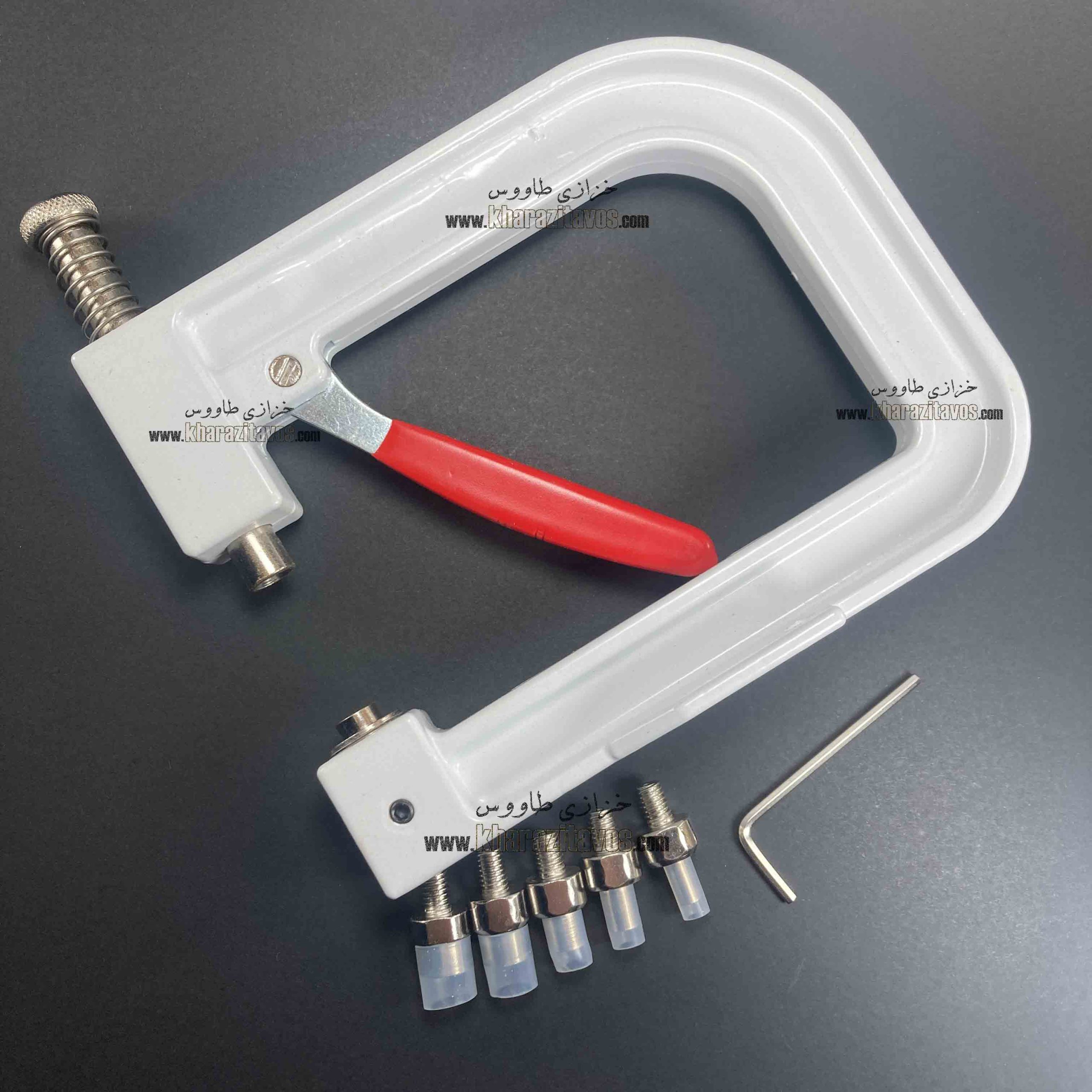این دستگاه برای پرس مروارید و نگین مورد استفاده قرار میگیرد داراری 5 سایز قالب و یک عدد آچار تنظیم می باشد