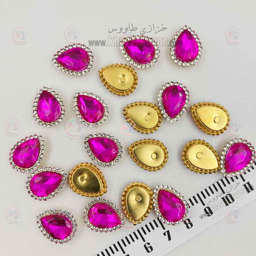 سایز نگین داخل 7 در 15 و سایز نگین دورچین آن 14 در 18 میلیمتر می باشد. نگین دور چین شده آن سایز 6 می باشد که در فروشگاه موجود می باشد رنگ پایه طلایی از زیر جای دوخت دارد کد محصول : 069101404