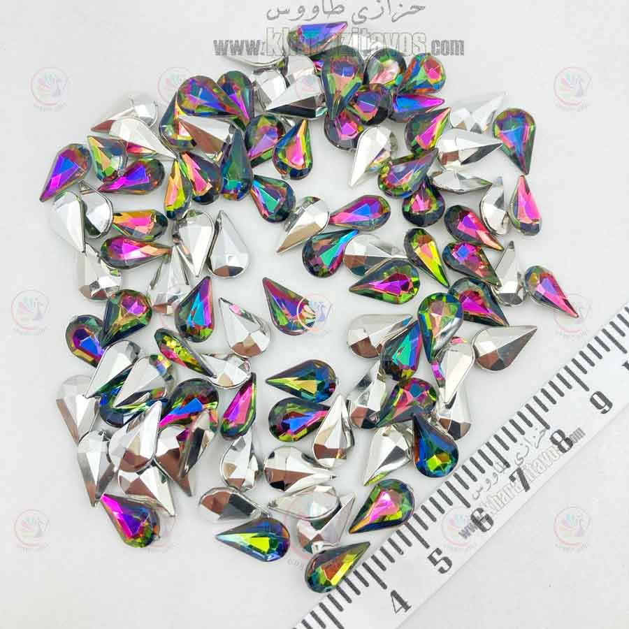 مارکیز اشکی پلاستیکی پر طاووسی با ابعاد 8 در 13 میلیمتر به دلیل تراش دقیق و سطح براق، ظاهری مشابه سنگ 8 در 13 دارد